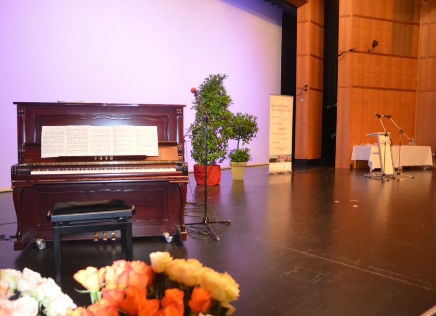 Zur musikalischen Einstimmung der im Anschluss folgenden feierlichen Übergabe der Abiturzeugnisse spielten Elisabeth Schmid (9a) am Horn sowie Thomas Riefle am Klavier das Stück „Melodie Nr. 1 in g-moll“ von Charles Gounod.