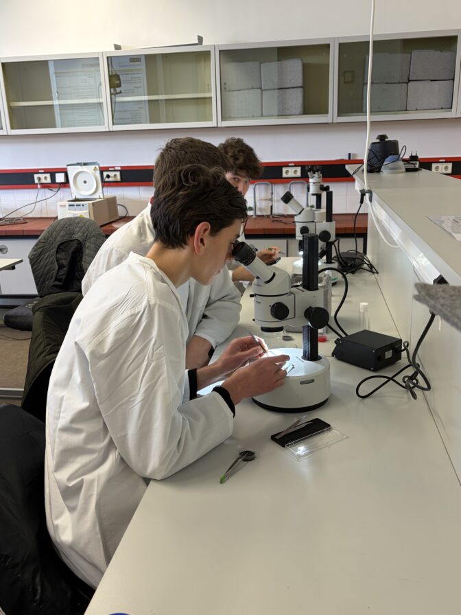 Zu Beginn wurden die Schülerinnen und Schüler empfangen und hörten einen informativen Vortrag über ein aktuelles Forschungsprojekt. Dabei ging es um Experimente mit Fliegen, die in der Forschung häufig genutzt werden, um genetische Prozesse besser zu verstehen. Es wurde erklärt, wie solche Experimente ablaufen und warum diese kleinen Lebewesen für die Wissenschaft so wichtig sind.