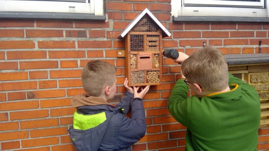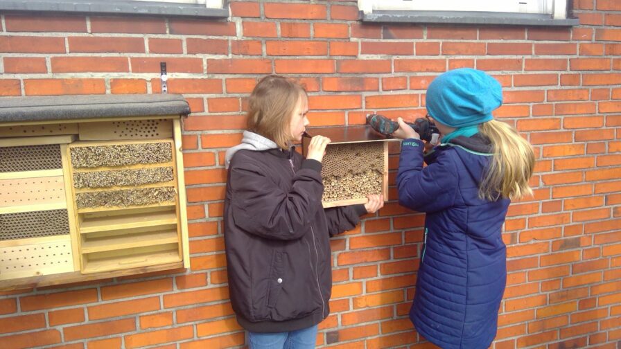 Mit großem Einsatz und in passender Frühlingssonne hat die Naturforscher-AG verschiedene Nisthilfen für Wildbienen und andere blütenbestäubenden Insektenarten an einer warmen Südwand an der Schützenstraße angebracht.