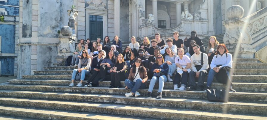 Unsere Partnerschule, die Escola Segundária Leal da Câmera, liegt im Verwaltungsgebiet von Sintra und somit bezogen wir unser Quartier in der Unesco Weltkulturerbestätte. Das Projekt, an dem unsere Schüler/innen gemeinsam mit den portugiesischen Schüler/innen arbeiteten, hatte es in sich: Die Schüler/innen bekamen Gedichte großer portugiesischer und deutscher Dichter wie Fernando Pessoa und Wolfgang von Goethe und den Auftrag, diese zu lesen und vortragen zu üben. Die portugiesischen Schüler/innen standen dabei vor der besonderen Herausforderung, dass sie noch nie Deutsch gesprochen hatten. Im Anschluss haben die Schüler/innen die Gedichte in gemischten Paaren in einem professionellen Aufnahmestudio mit Mikrofonen und Green Screen vorgetragen. Diese Vorträge wurden im Anschluss gesichtet und zu einem Film mit dem Titel „Begegnung poetischer Weltliteratur aus Portugal und Deutschland“ zusammengeschnitten. Im Auditorium der Schule konnten wir anschließend das fertige Produkt betrachten und das gemeinsame Lachen über die offensichtlichen Schwierigkeiten beim Vortragen der in der Tat anspruchsvollen Sprache verband die deutschen und die portugiesischen Schüler/innen.